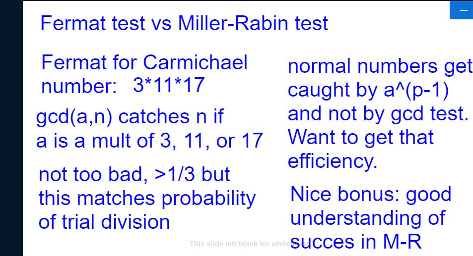session we covered Miller-Rabin vs. Fermat for primality test